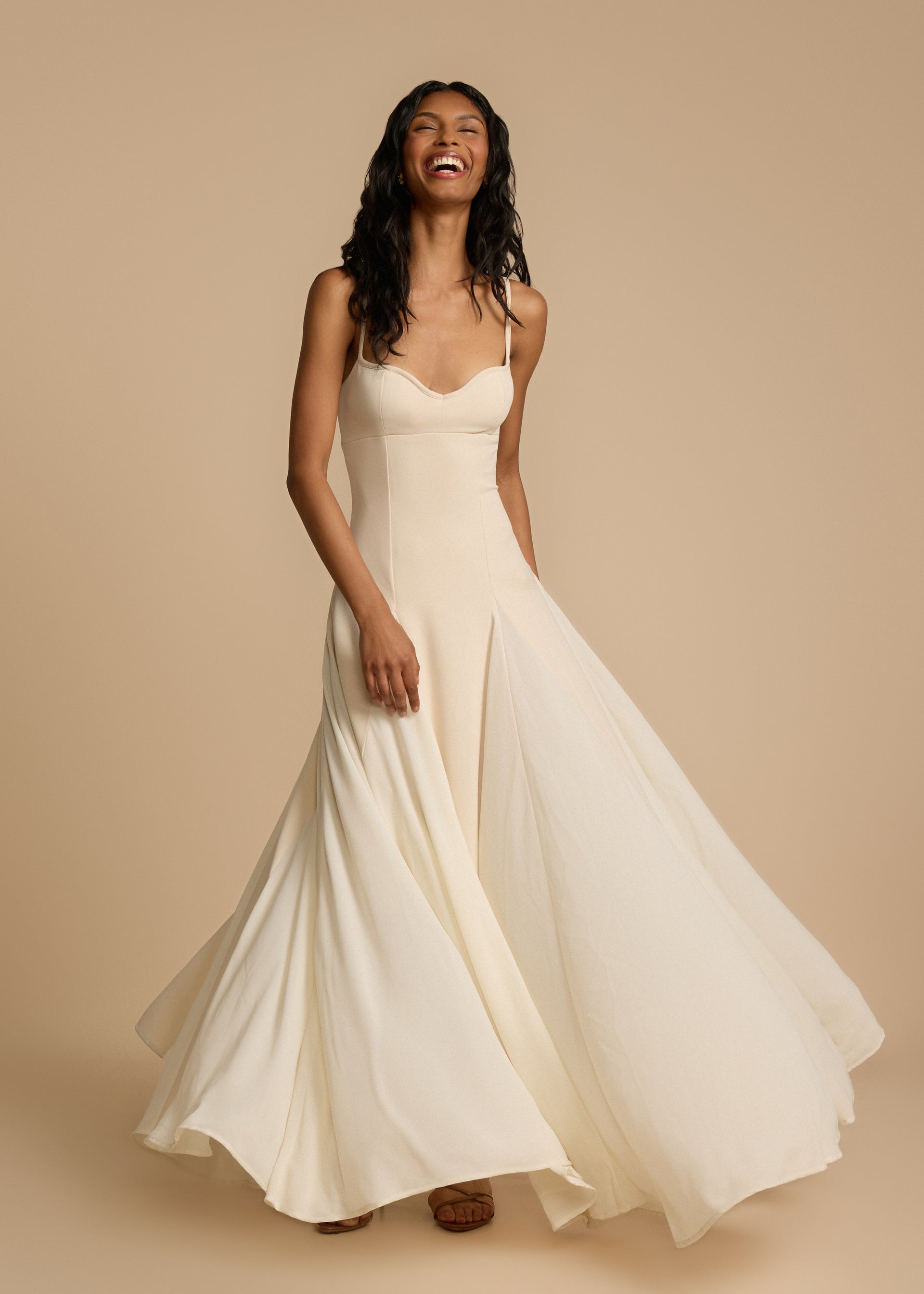 Introducing Paloma, a captivating blend of timeless elegance and contemporary flair. Featuring a striking panelled A-line skirt that sits effortlessly off the hips and flaires lightly with a cream georgette. Complete with padded bra cups and binded edges for added lift and support. Paloma exudes sophistication from every angle.